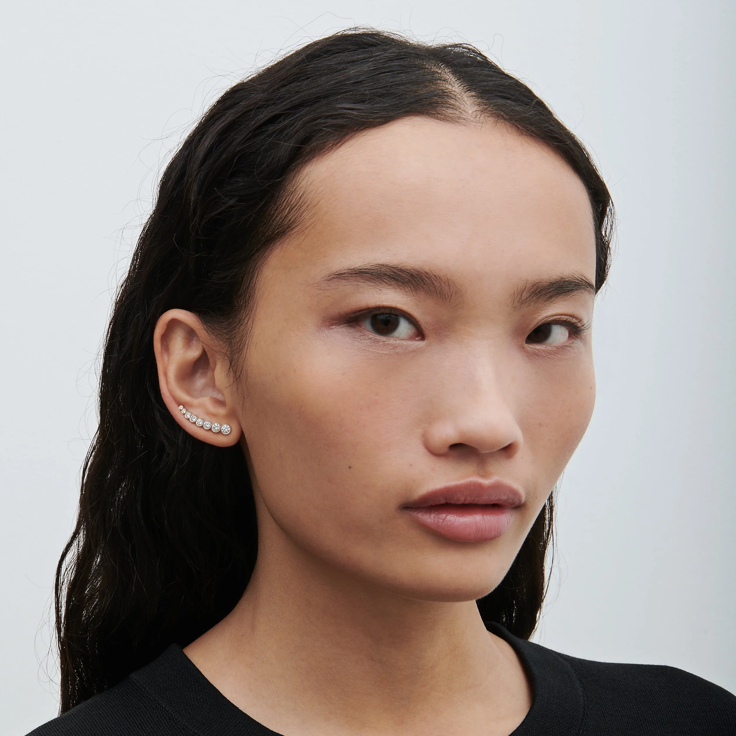 The Croissant de Lune is a single earring, with a crescent of tapering diamonds that hug the curve of the ear.